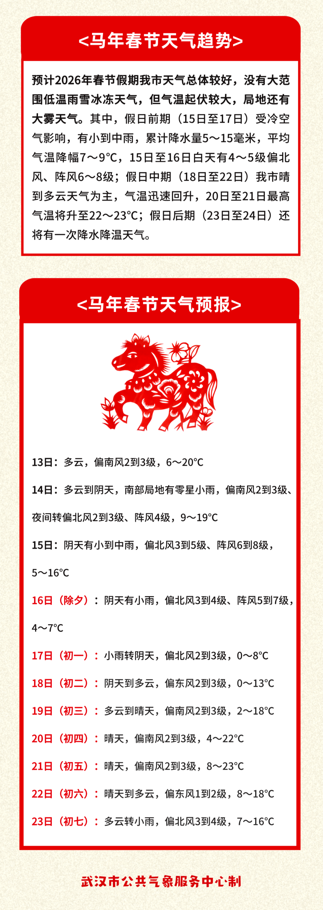 今年春节天气如何?日前,武汉气象发布2026年武汉春节天气预报,请您提前计划出行。