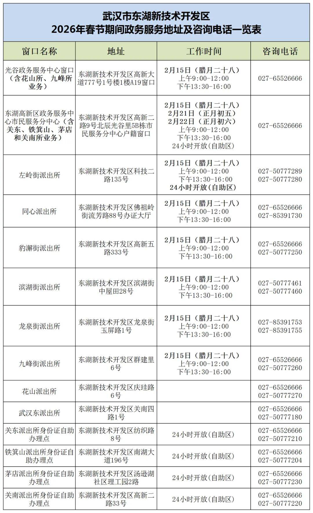 各派出所(正月初一至初七)在辖区大型社区、商圈设置16个便民服务点,接受群众咨询、求助及报警,提供便捷、温馨的服务。